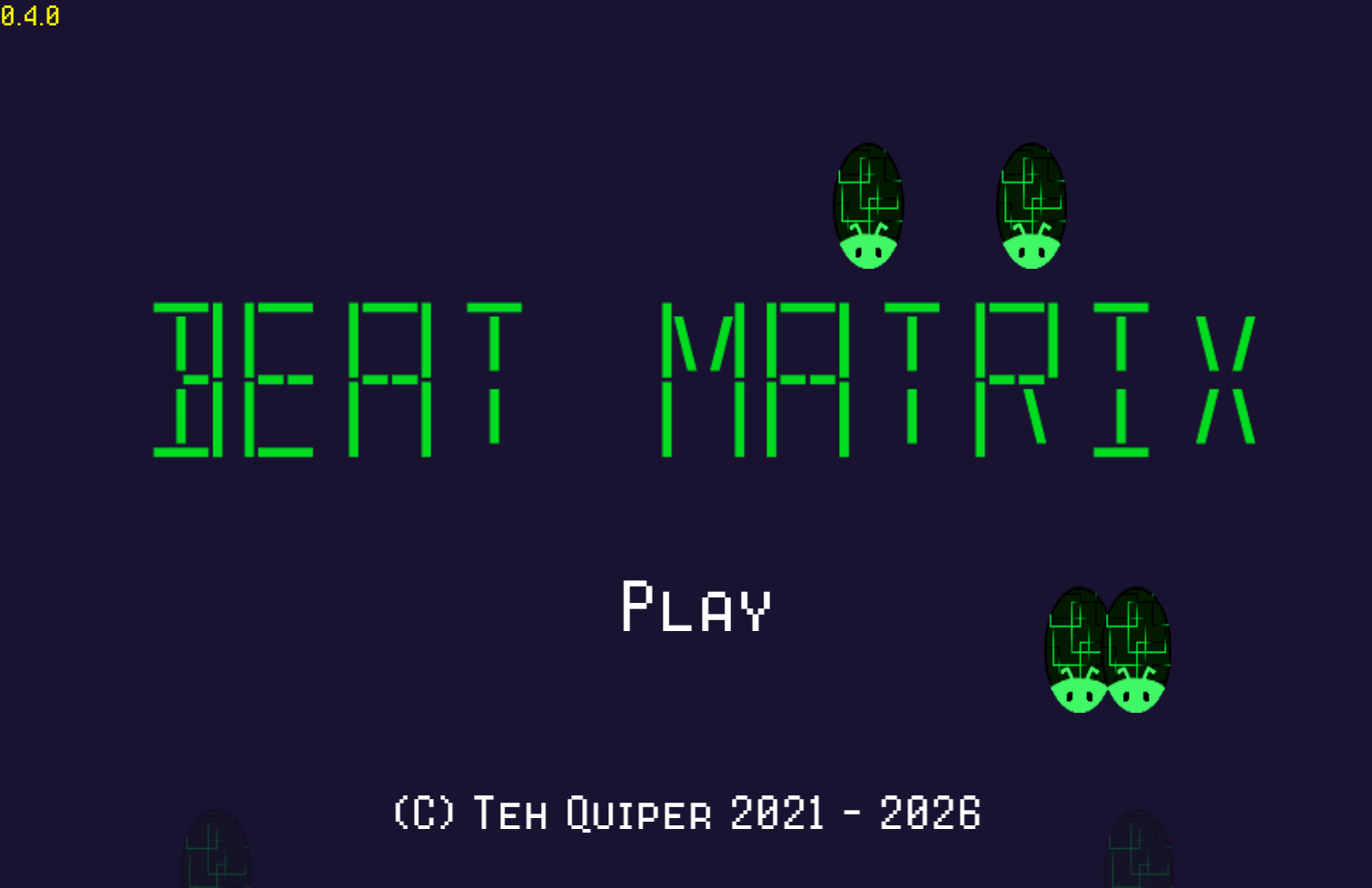 Beat Matrix is a rhythm game where you use visual cues, known as Beat Bugs, to time key presses to the beat of the music. Some Beat Bugs will move faster or slower than normal. Each level in the game utilizes settings to either require one hand or both hands to play them, as well as to change the difficulty between "Simple" or "Advanced". This rounds out to 4 difficulty options per level. Rack up a high combo and a high score! In some levels you can use the Beat Mixer after scoring enough Beat Bugs to transition from one level to another. This feature is new to 0.4.0, so only 2 levels let you do that.